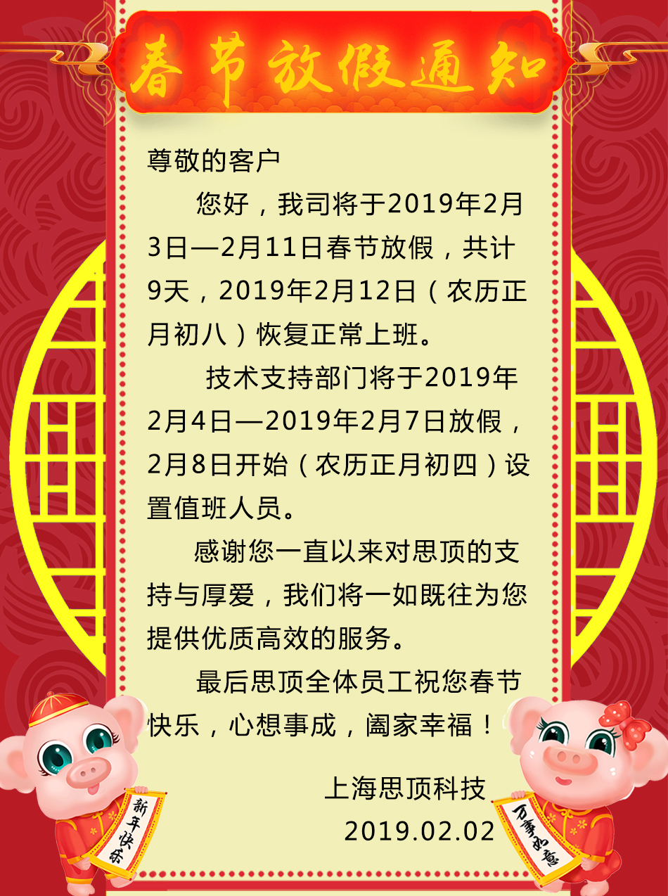 新春伊始,万象更新。思顶全体员工在这里祝福大家猪年吉祥,好运平安,阖家欢乐,万事如意!