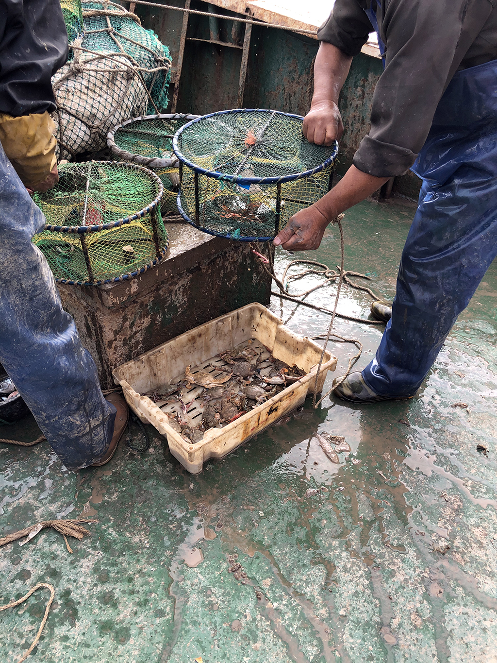 大家都兴奋的观看渔民作业,刚捞上来的梭子蟹等,小厮准备的前排小板凳终于派上用场了!!
